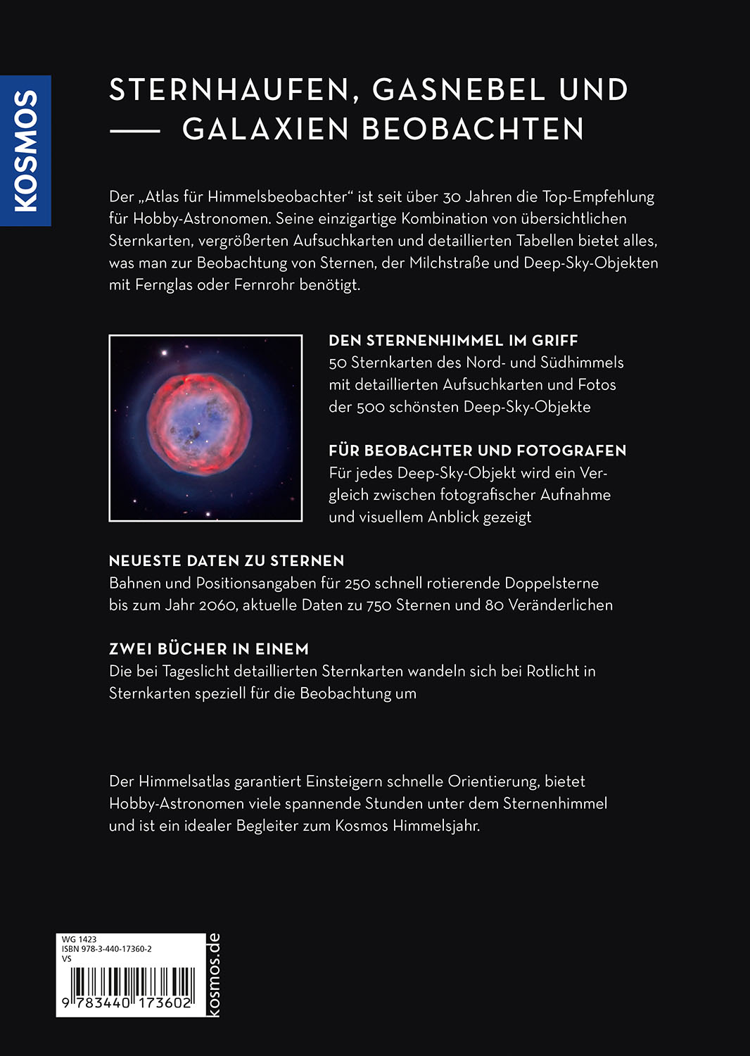 Der „Atlas für Himmelsbeobachter“ ist eine Legende unter Hobby-Astronomen und seit über 25 Jahren die Top-Empfehlung. Jetzt erscheint das Standardwerk in einer vollständig neu bearbeiteten Ausgabe: in größerem Format, mit neuen, farbigen Sternkarten, mit topaktuellen Daten der Raumsonde Gaia und einmaligen Vergleichsbildern der Himmelsobjekte. So lassen sich Sternhaufen, Gasnebel und Galaxien noch sicherer finden. Insgesamt stellt der Atlas 500 der schönsten Deep-Sky-Objekte vor, die mit Fernglas und Fernrohr beobachtet werden können. Das garantiert Einsteigern schnelle Orientierung und bietet Hobby-Astronomen viele spannende Stunden unter dem Nachthimmel.