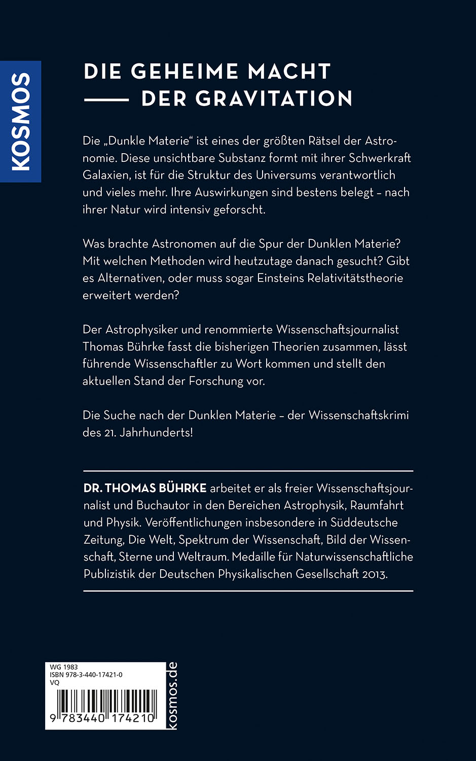 Die sogenannte „Dunkle Materie“ ist eines der größten Rätsel der Astronomie. Die unsichtbare Kraft formt Galaxien, bestimmt die Struktur des Universums – und spaltet die Wissenschaft. Doch was brachte die Forschung auf die Spur der Dunklen Materie? Mit welchen Methoden wird heutzutage danach gesucht? Welche Alternativen gibt es und was würde das für unser Verständnis vom Weltall bedeuten? Der renommierte Wissenschaftsjournalist Thomas Bührke schildert die bisherigen Theorien, Experimente und Ergebnisse, lässt führende Wissenschaftler zu Wort kommen und stellt den aktuellen Stand der Forschung vor.