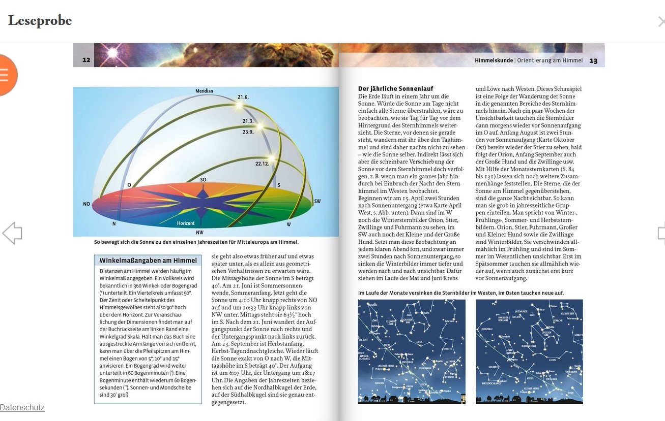 Der bewährte Naturführer bietet alles, was Einsteiger zu kundigen Himmelsbeobachtern macht. Leicht verständlich werden der Lauf von Sonne, Mond und Planeten erklärt, Sterne, Sternbilder und Galxien vorgestellt und erläutert wie die Himmelsbeobachtung mit bloßem Auge, Fernglas und Fernglas funktioniert. 48 Karten zeigen den Sternenhimmel für jeden Monat und jede Himmelsrichtung. So findet man ausgehend vom Großen Wagen weitere Sternbilder und besondere Himmelsobjekte. Eine Vorschau der Himmelsereignisse bis 2029 rundet diesen praktischen Himmelswegweiser ab.