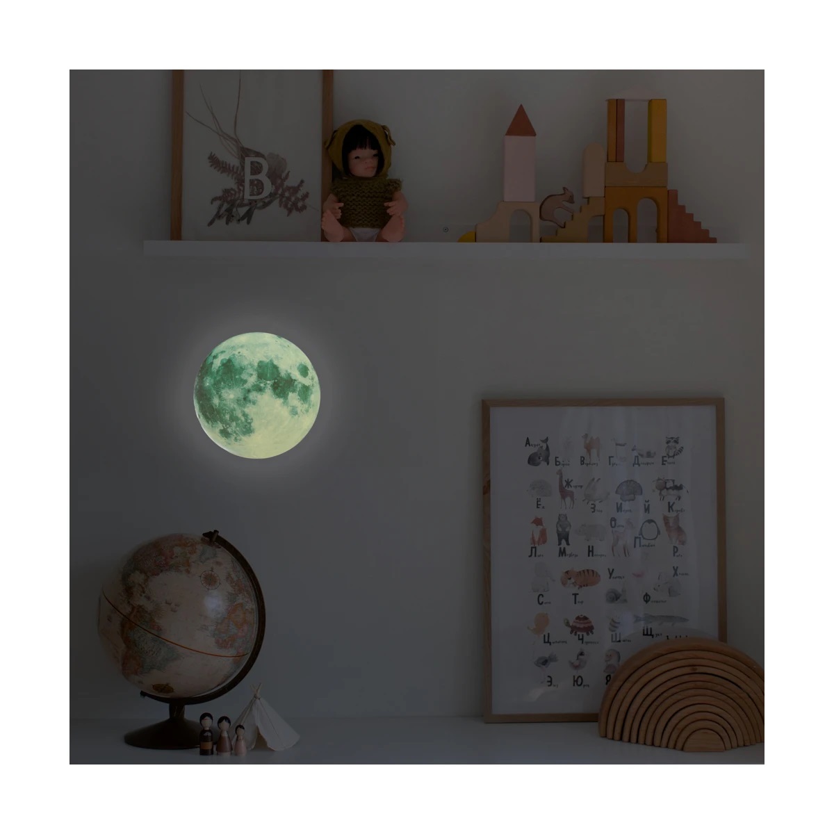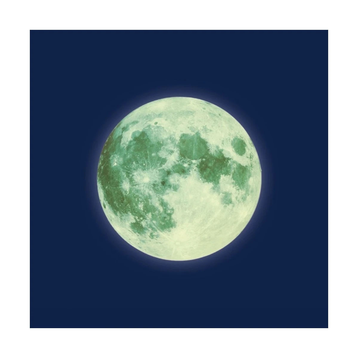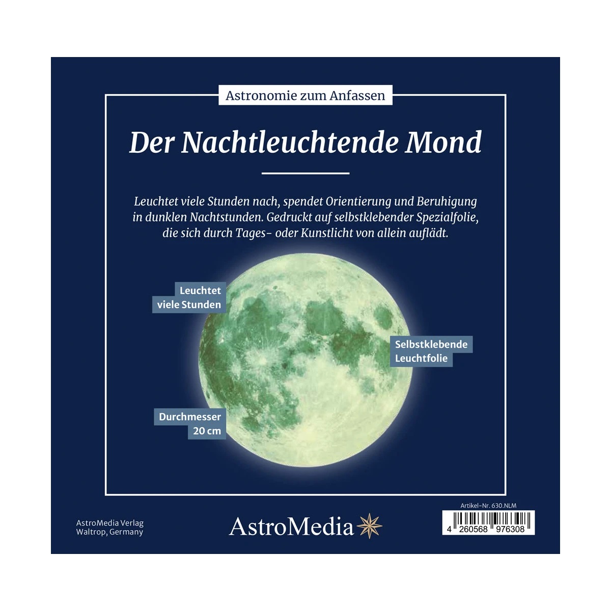 Diese detaillierte Darstellung der Mondoberfläche wurde auf eine selbstklebende Spezialfolie gedruckt, die sich am Sonnen- oder auch am Kunstlicht auflädt und dann viele Stunden lang nachleuchtet. Auch am Ende der Nacht hebt sich der Mond immer noch mit einem sanften Schimmer im Dunkeln ab. Dies hat nicht nur eine angenehm beruhigende Wirkung, es kann sogar eine wichtige Orientierungshilfe in der Dunkelheit sein. Aus diesem Grund sind auch in vielen öffentlichen und gewerblichen Gebäuden an wichtigen Stellen Sicherheitsmarkierungen und Hinweisschilder aus diesem Material zu finden.