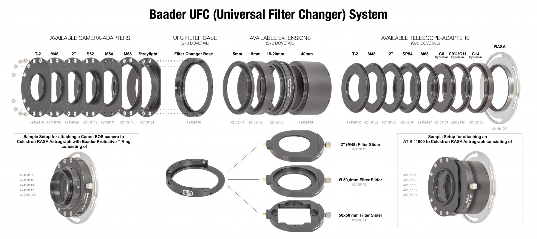 Das Baader UFC- System (Universal Filter Changer) schließt eine große Lücke. Es gibt auf dem Markt keine so vielseitig für verschiedenste Teleskop- und Kamerasysteme verwendbare Filterschublade mit genügend großem Anschlussdurchmesser, welche gleichzeitig extrem kurzbauend ist, aber auch Filtergrößen bis zu 50x50 mm vignettierungsfrei aufnimmt. Diese Eigenschaften sind Bedingung um die neuen, schnellen Optiken wie z. B. SC/HD Teleskope mit Hyperstar und die neuen RASA Geräte von Celestron, sowie alle anderen Prime-Focus Astrografen mit geeigneten Filtern betreiben zu können, an denen ein reguläres Filterrad zu viel von der Frontöffnung abschatten würde. Zudem sind Prime-Fokus-Optiken zwangsläufig mit sehr kurzem Backfocus ausgestattet und erfordern eine besonders platzsparende Filterschublade. Am 11" RASA lässt sich ein UFC mit einer FLI-Kamera ML16803 oder mit einer FLI ML16200 höchst effektiv anwenden. Die ML Kameras von FLI eigenen sich durch ihre kompakte und runde Bauform besonders für den Einsatz an Prime-Focus-Optiken. Da Celestron für die RASA Geräte nur die für DSLR gängigen T-2 und M48 Gewindeadapter anbietet, war die Adaption einer großen CCD Kamera mit Filterwechsler bislang nicht möglich.