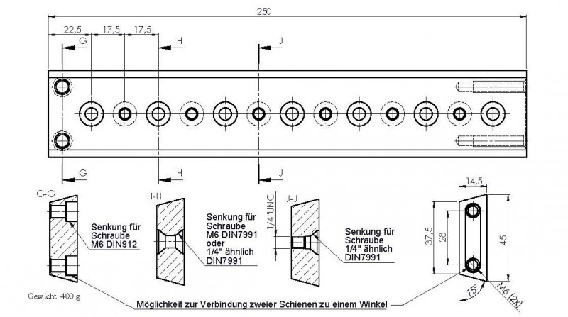 mit Gewindebohrungen 1/4" für Senkkopfschrauben im Abstand von 35 mm und Durchgangsbohrungen für Senkkopfschrauben M6 bzw. 1/4" im Abstand von 35 mm