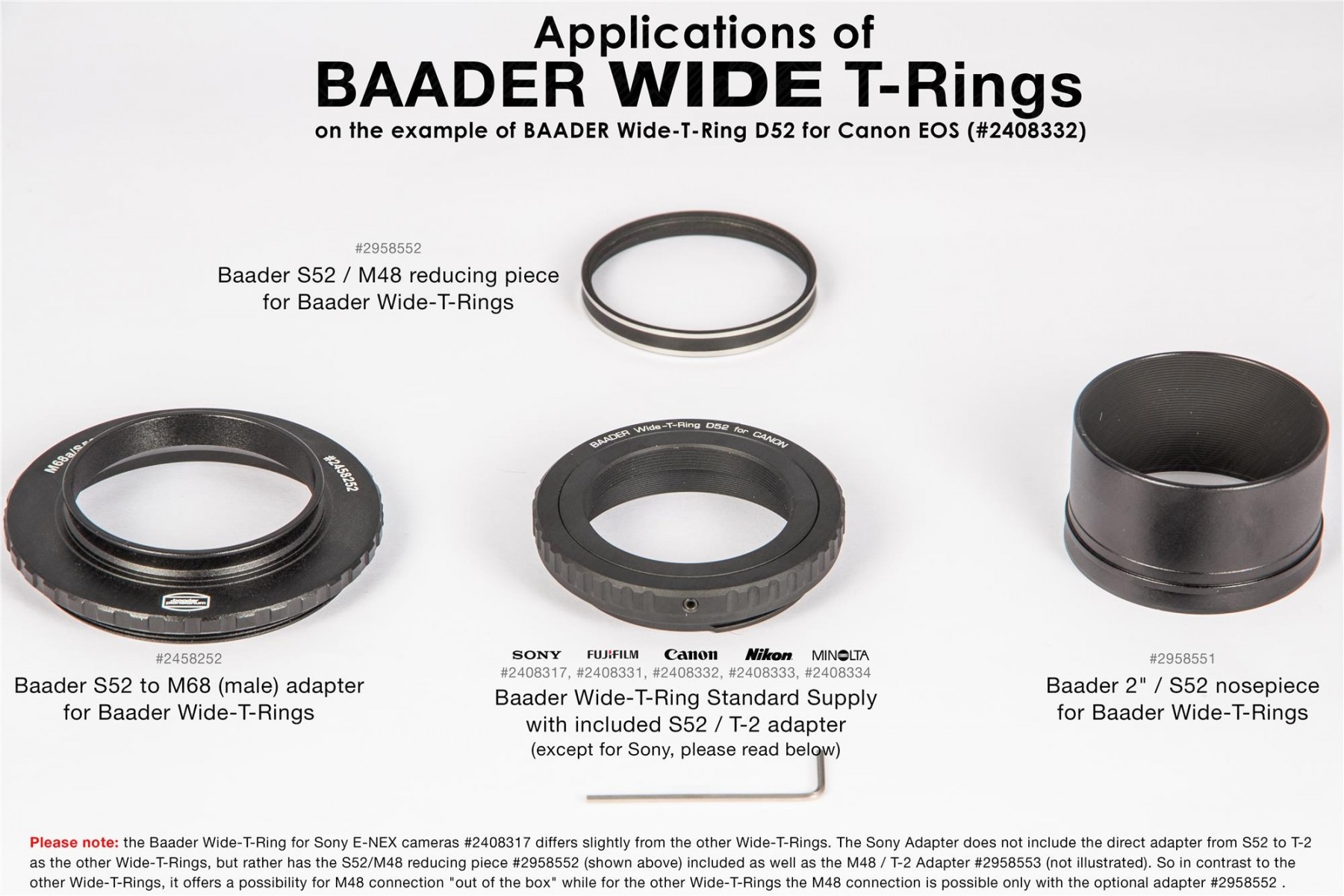Wide-T-Ring Sony E/NEX Bajonet mit D52i/M48 auf T-2 und S52