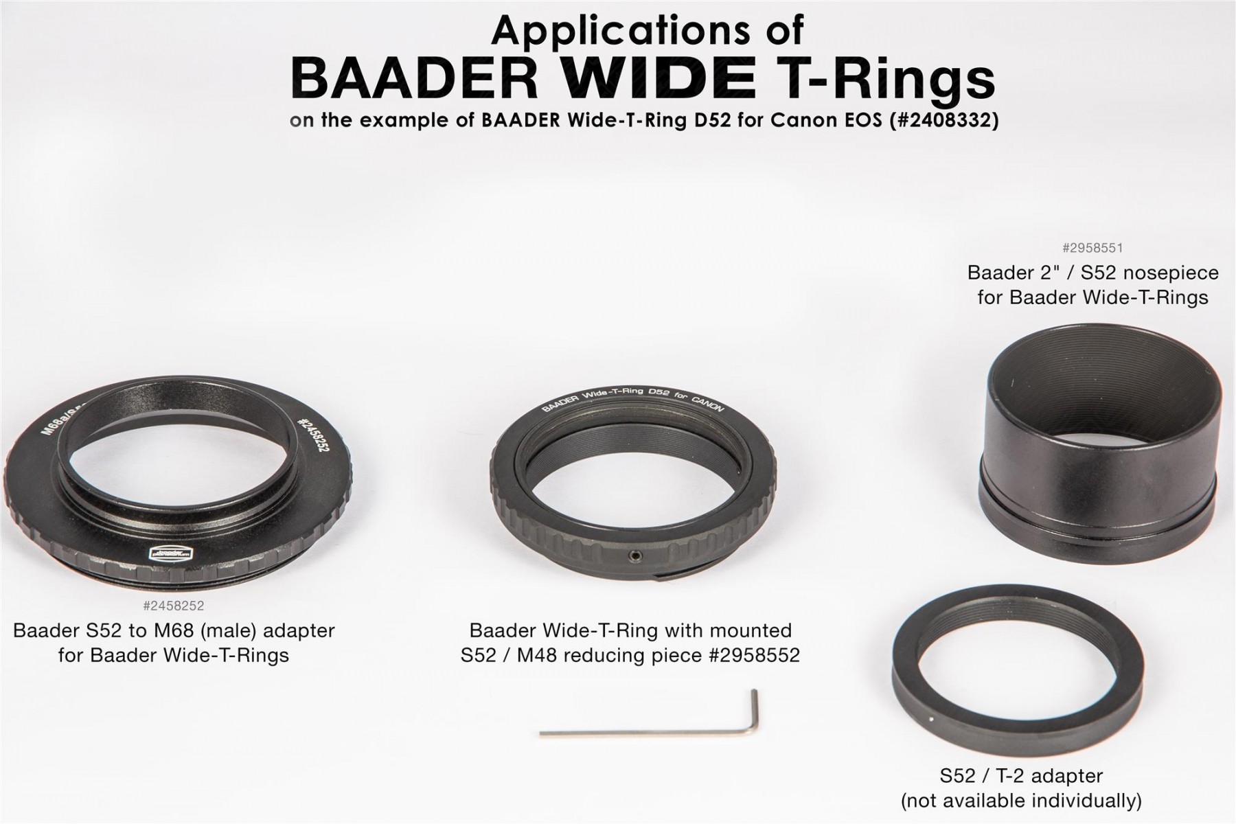 Alle Baader Wide-T-Ringe haben neben dem Einsatzring auf T-2 eine S52 Schwalbenschwanzaufnahme. Diese ermöglicht es den T-Ring mittels S52/M48 Adapter #2958552 auf ein M48 Innengewinde zu modifizieren, oder die S52 Steckhülse #2958551 ohne die Einschnürung auf T-2 verwenden zu können. Mit dem S52/M68 Adapter #2458252 kann der Wide-T-Ring direkt auf ein M68 Außengewinde adaptiert werden, um Ihre Kamera mit dem größtmöglichen Durchlass fest zu verschrauben.