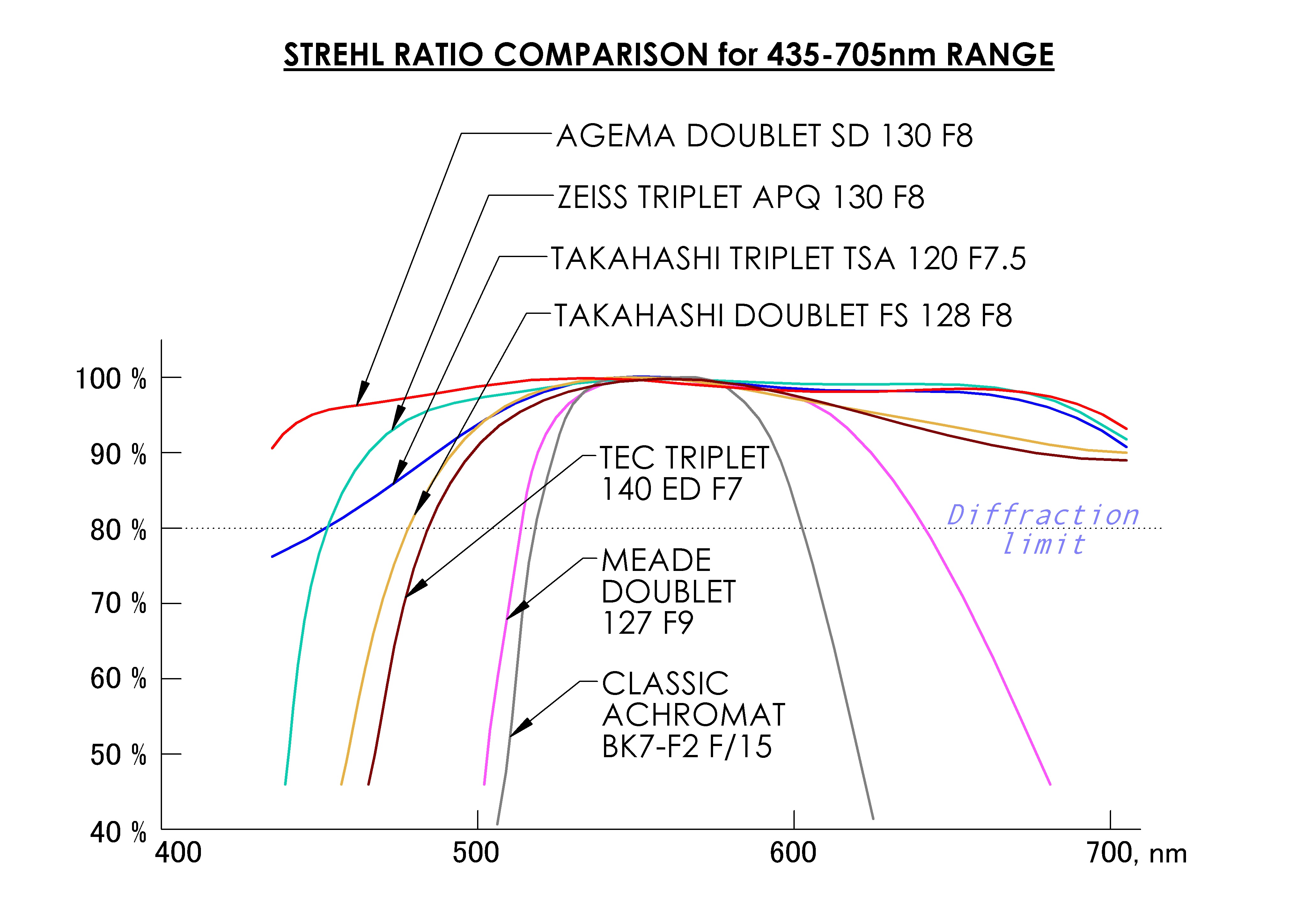 Man sieht, dass über alle Wellenlängen des sichtbaren Lichts, das Objektiv des Agema Optics Apo SD 130 weit über den Werten klassischer Refraktoren liegt und sich mit anderen Apochromaten der Spitzenklasse messen kann.