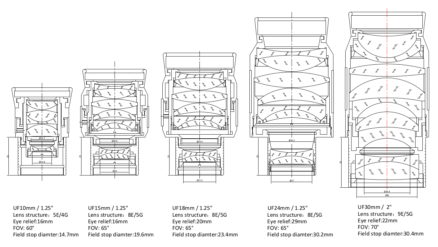 Die Schnittzeichnungen für alle APM Ultra Flat Okulare, ganz rechts für das 2" 30 mm Okular: