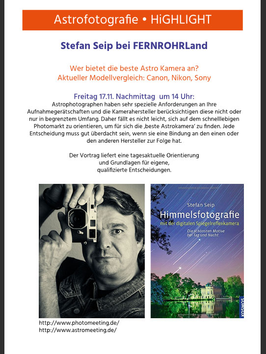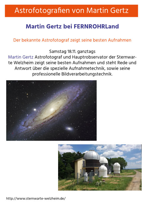 Auch Fernrohrland ist in diesem Jahr mit tollen Angeboten, Teleskopausstellung, einem Fernglas Shootout mit Mike Eick und Fernrohrjustage von Wolfgang Grzybowski, sowie Vorträgen von Stefan Seip und Martin Gertz bestens auf Sie vorbereitet.