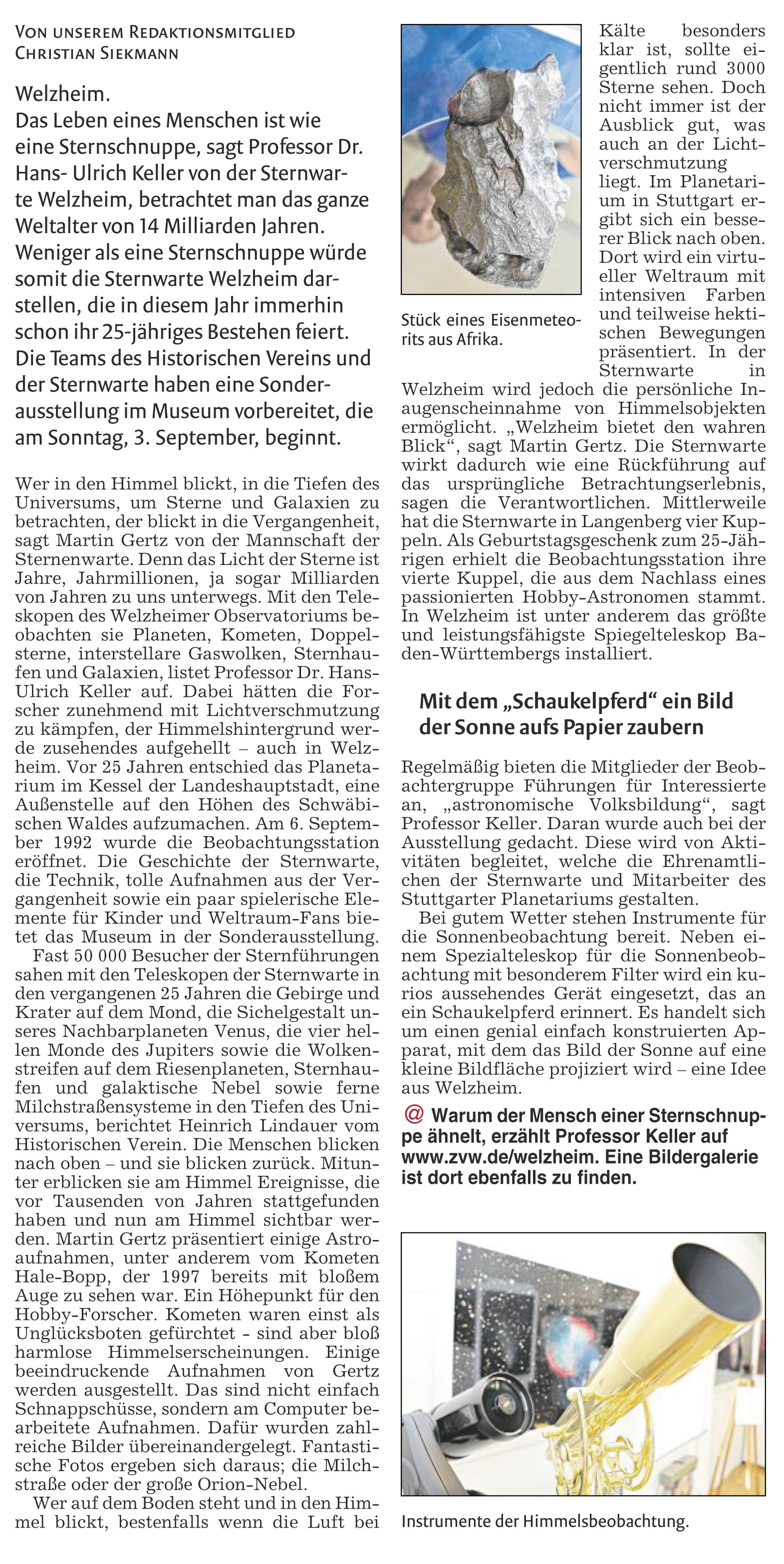 Aus Anlass des 25-jährigen Bestehens der Sternwarte Welzheim sind die schönsten Astroaufnahmen, die von der Sternwarte gemacht wurden, zu sehen.