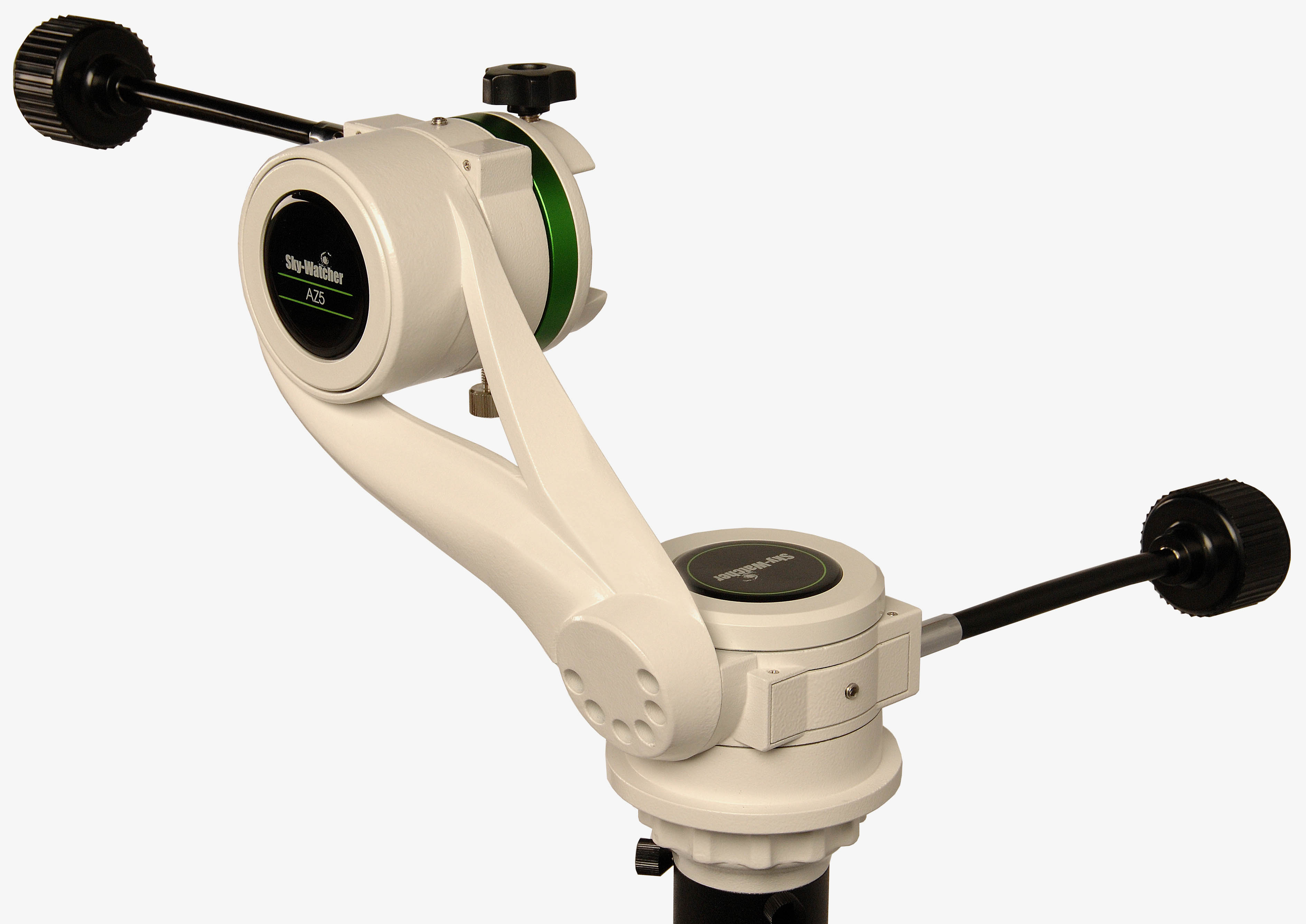 Die azimutale AZ5 Deluxe Montierung lässt sich einfach auf jedes Stativ mit Standard 3/8" Fotogewinde Anschluss montieren. Sie wurde aus solidem Aluminium Guss gefertigt für kleinere Teleskope mit bis zu 5 kg Gewicht, die sich mit einer Vixen / Skywatcher Norm Schwalbenschwanzschiene einfach befestigen lassen. Sie können aber auch andere Geräte mit einem optional erhältlichen L-Halter verwenden. Enthalten sind zusätzlich zwei biegsame Wellen zur Betätigung der Feinuntersetzungen. Sie können die Montierung aber auch manuell in jeder Achse bewegen, für schnelles Schwenken in horizontaler und vertikaler Richtung.