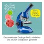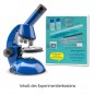Inhalt: Mikroskop (bis zu 600fache Vergrößerung) mit batteriebetriebener LED-Beleuchtung, Präparierzubehör (Objektträger (Kunststoff), Deckglasfolien, Pipette, Pinzette, Präpariernadel, Probengefäße), farbige Anleitung (32 S.)