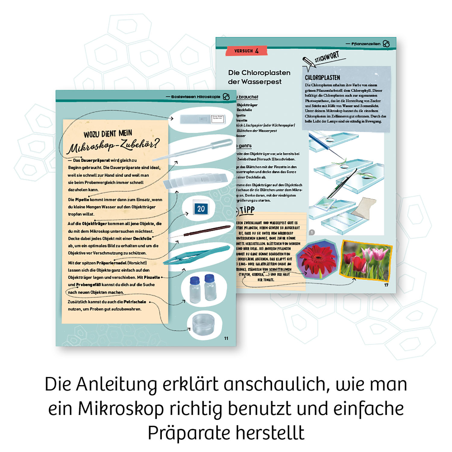 Das Begleitheft enthält eine übersichtliche Anleitung zur Benutzung des Mikroskops und ermöglicht mit spannendem Hintergrundwissen einen einfachen, wissenschaftlichen Einstieg in die Mikroskopie.