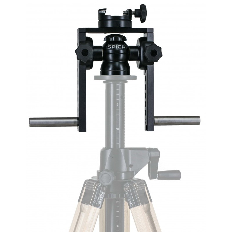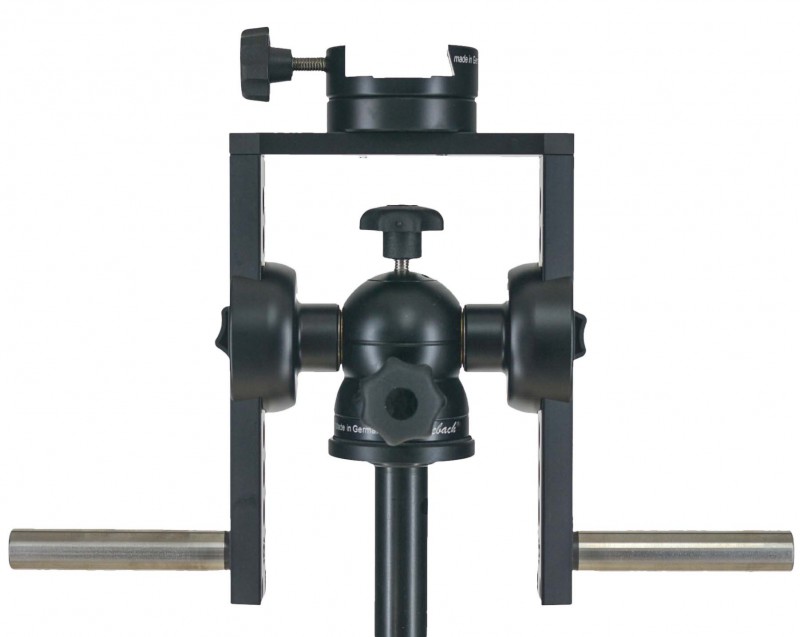 Da die Klemmeinheit für die Instrumente nicht wie üblich zwischen der Gabel sondern oben montiert wird, ist genügend Platz vorhanden, um auch sehr große Optiken wie Binoculare zu befestigen.