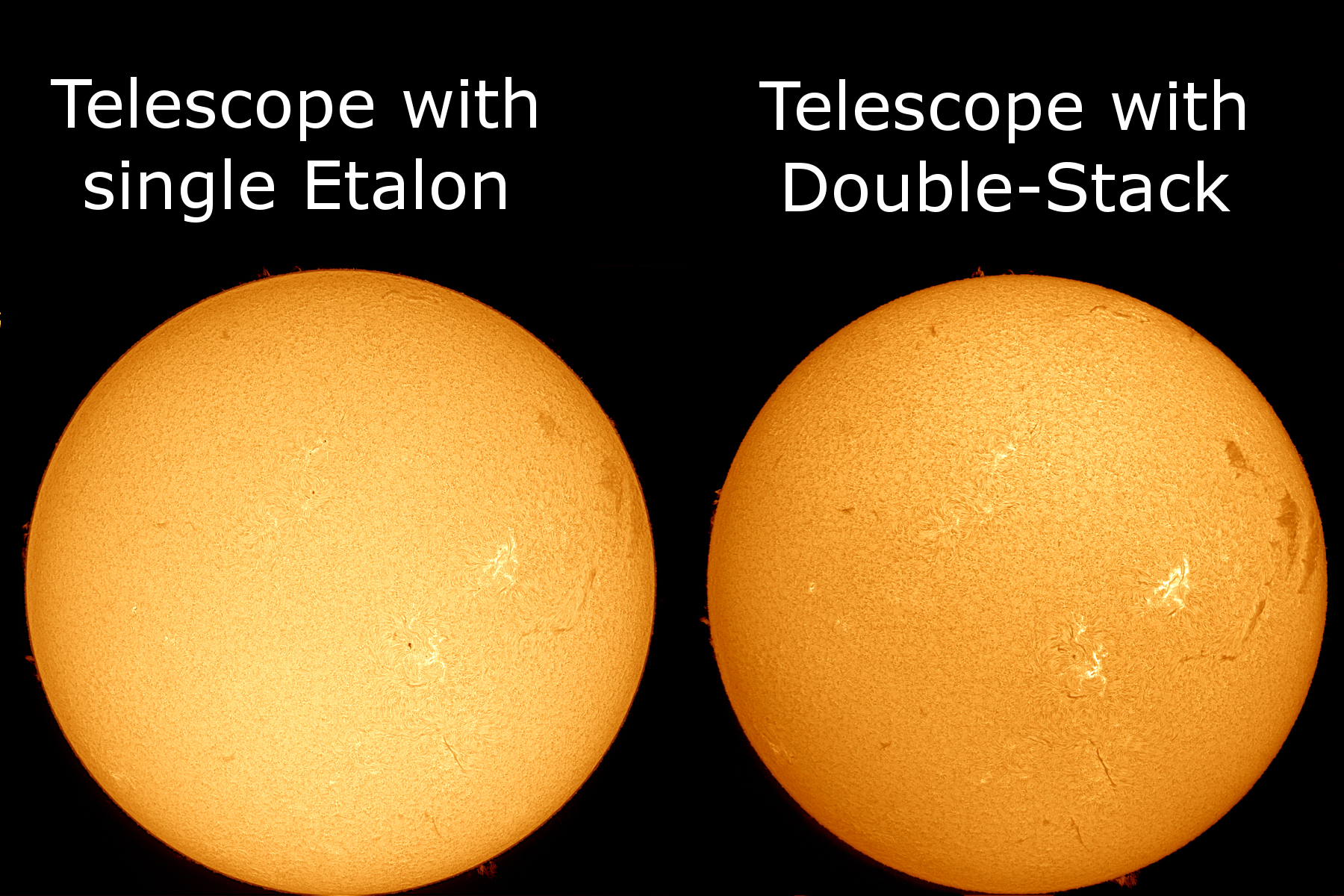Bei den LS80MT und LS100MT Teleskopen ist bei der Sonnenbeobachtung in H-Alpha Double-Stacking möglich mit diesem internen DSII Double-Stack Modul. Die DSII Module reduzieren die Halbwertbreite auf <0,5 Angström. Sie sind dazu konzipiert die Oberflächendetails der Sonne besser zu zeigen, der Kontrast wird deutlich erhöht und damit Filamente und aktive Regionen besser sichtbar.
