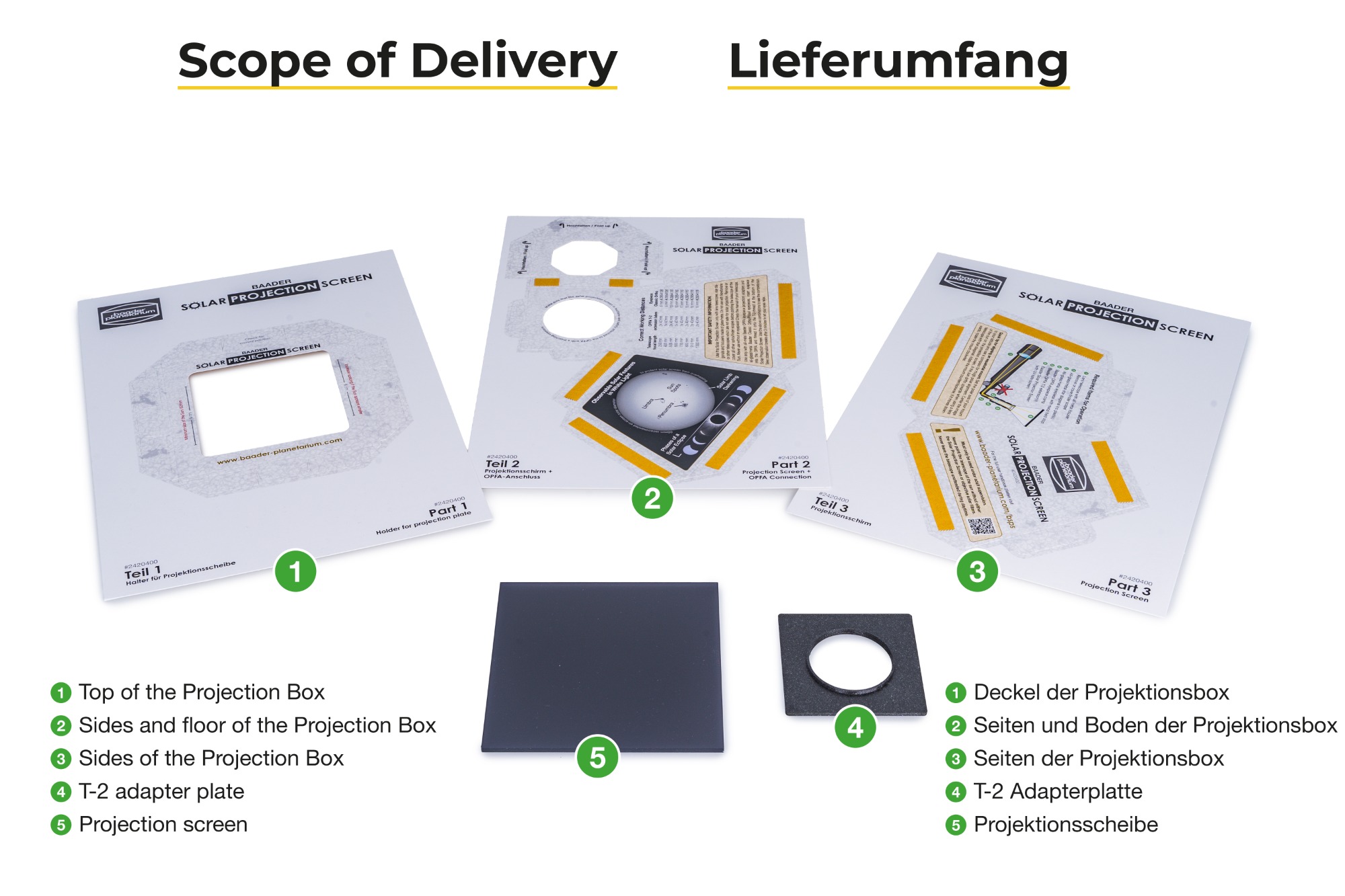 Der BSPS besteht aus dem speziellen Projektionsschirm, einem T-2 Gewindeadapter und einem vorgestanzten Kartonbausatz aus drei Teilen mit vormontierten Klebestreifen, um das Gehäuse zu bauen. Alternativ können Sie auch die STL-Dateien herunterladen, um selbst ein Gehäuse samt Schutzdeckel aus Kunststoff auf einem 3D-Drucker herzustellen.