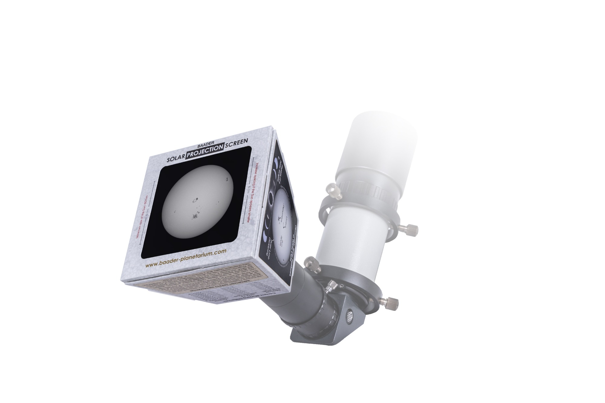 Einen variablen Okularprojektionsansatz mit T-2-Anschluss. Der Solar Projection Screen wurde für den Baader OPFA entwickelt. Der Durchmesser des Sonnenbilds hängt vom Abstand zur Projektionsfläche ab.