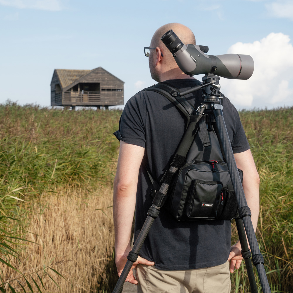 Der Caruba Skydex Target 100 ist ein praktischer Rucksack, in dem du dein Stativ und Teleskop problemlos transportieren kannst, ohne es ständig abbauen zu müssen. Einfach die Stativbeine mit dem Klettband an dem Rucksack befestigen und schon kann es losgehen.