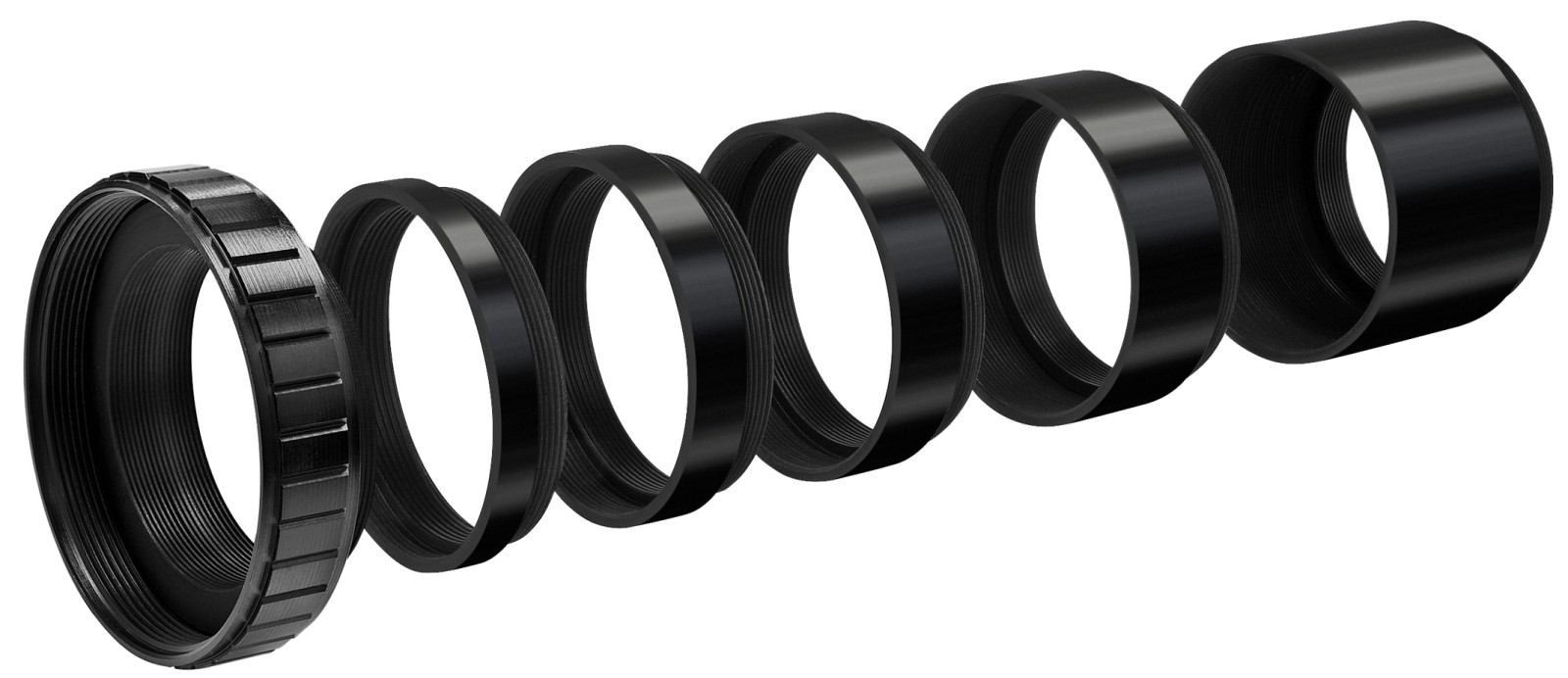 Set aus 5 Verlängerungshülsen mit je beidseitig T2-Gewinde, für exakte Abstände und sicheren Halt der Kameras zur Astrofotografie. Zusätzlich mit Adapter von SC- auf T2-Gewinde.