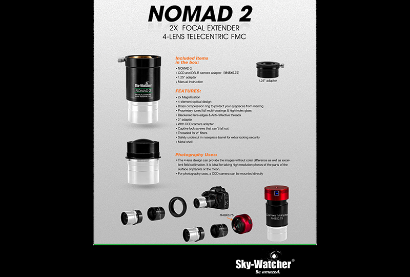 Der Sky-Watcher 2" Nomad-2 2-fach telezentrische Brennweitenverlängerer ist ein hochwertiges, optisches Zubehör mit einer Fülle von Verwendungsmöglichkeiten für die visuelle und fotografische Nutzung.
