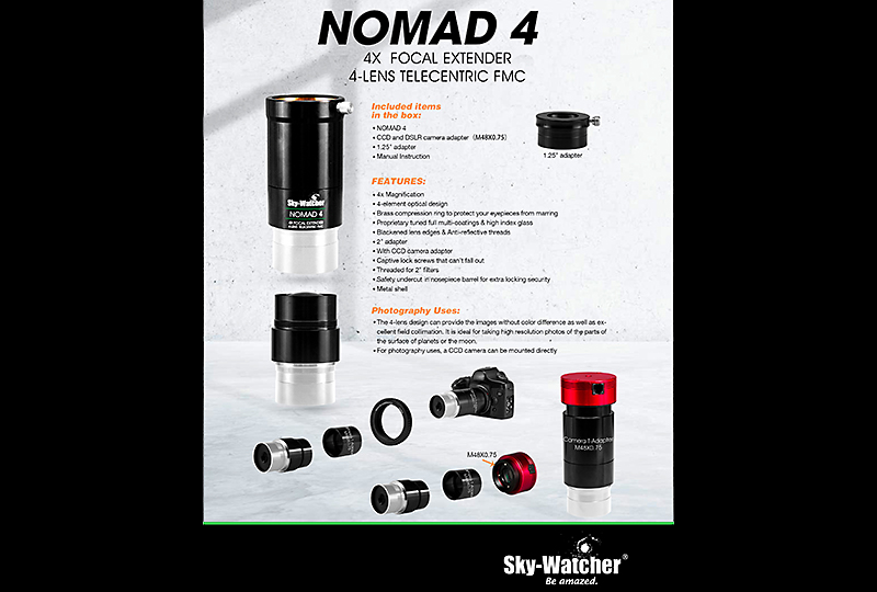 Der Sky-Watcher 2" Nomad-4 4-fach telezentrische Brennweitenverlängerer ist ein hochwertiges, optisches Zubehör mit einer Fülle von Verwendungsmöglichkeiten für die visuelle und fotografische Nutzung.