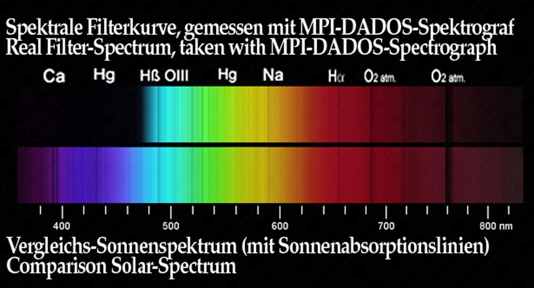 Baader-Rotfilter ≅ W25, Baader-Orangefilter ≅ W21, Baader-Gelbfilter ≅ W12, Baader-Grünfilter ≅ W58, Baader-Hellblaufilter ≅ W80A, Baader-Dunkelblaufilter ≅ W38A