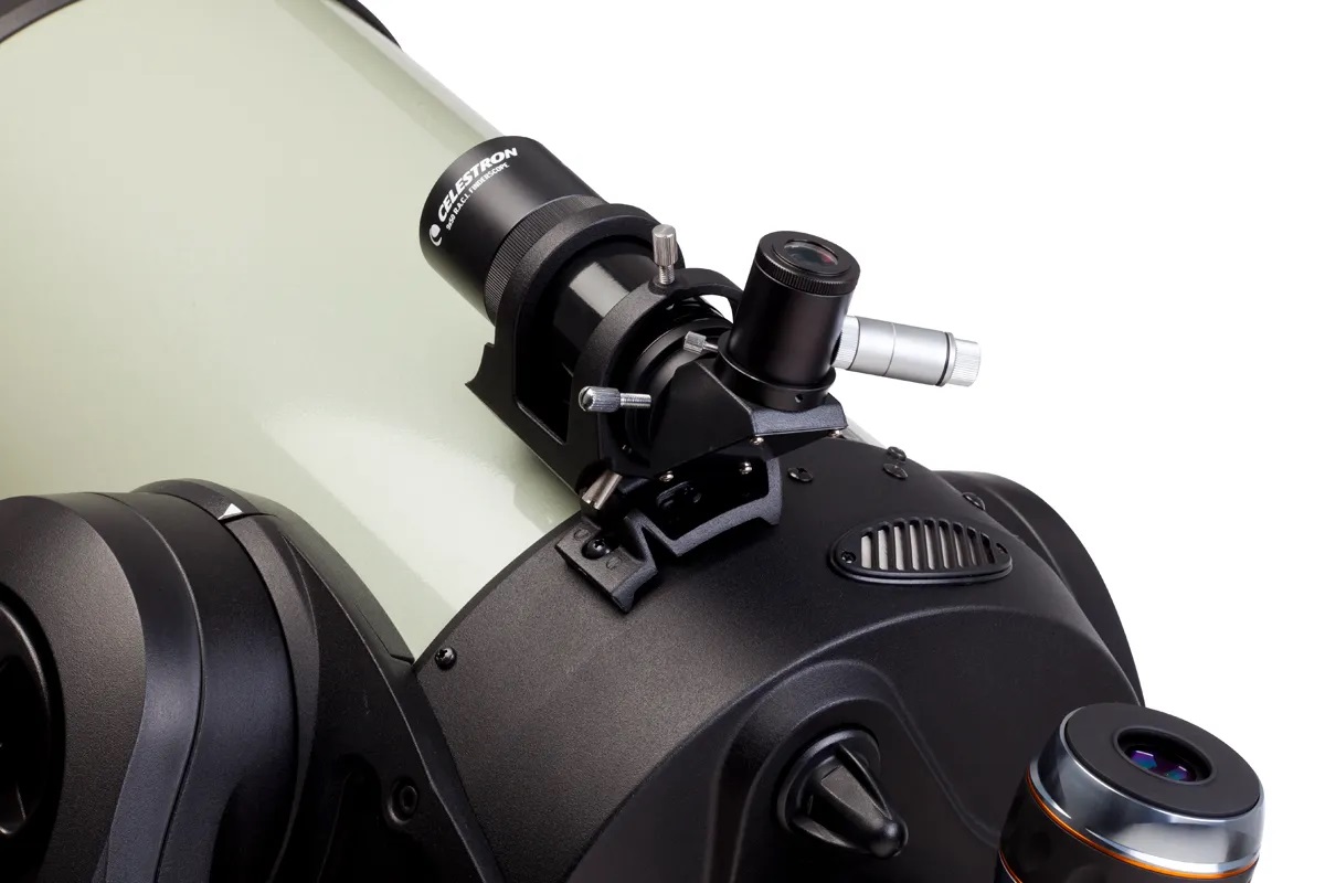 Zum Lieferumfang gehört eine stabile Halterung mit zwei justierbaren Rohrschellen sowie einer integrierten Prismenschiene. Die großen Rändelschrauben ermöglichen eine einfache und präzise Justage des Suchers. Dank der Prismenschiene lässt sich der Sucher problemlos an den meisten Schmidt-Cassegrain- und EdgeHD-Teleskoptuben montieren und wieder abnehmen, ohne die Ausrichtung des Suchers zu verändern. Zusätzlich verfügt das Okular über eine Aufnahme für einen optionale Beleuchtungseinheit mit M8x1,25-Gewinde.