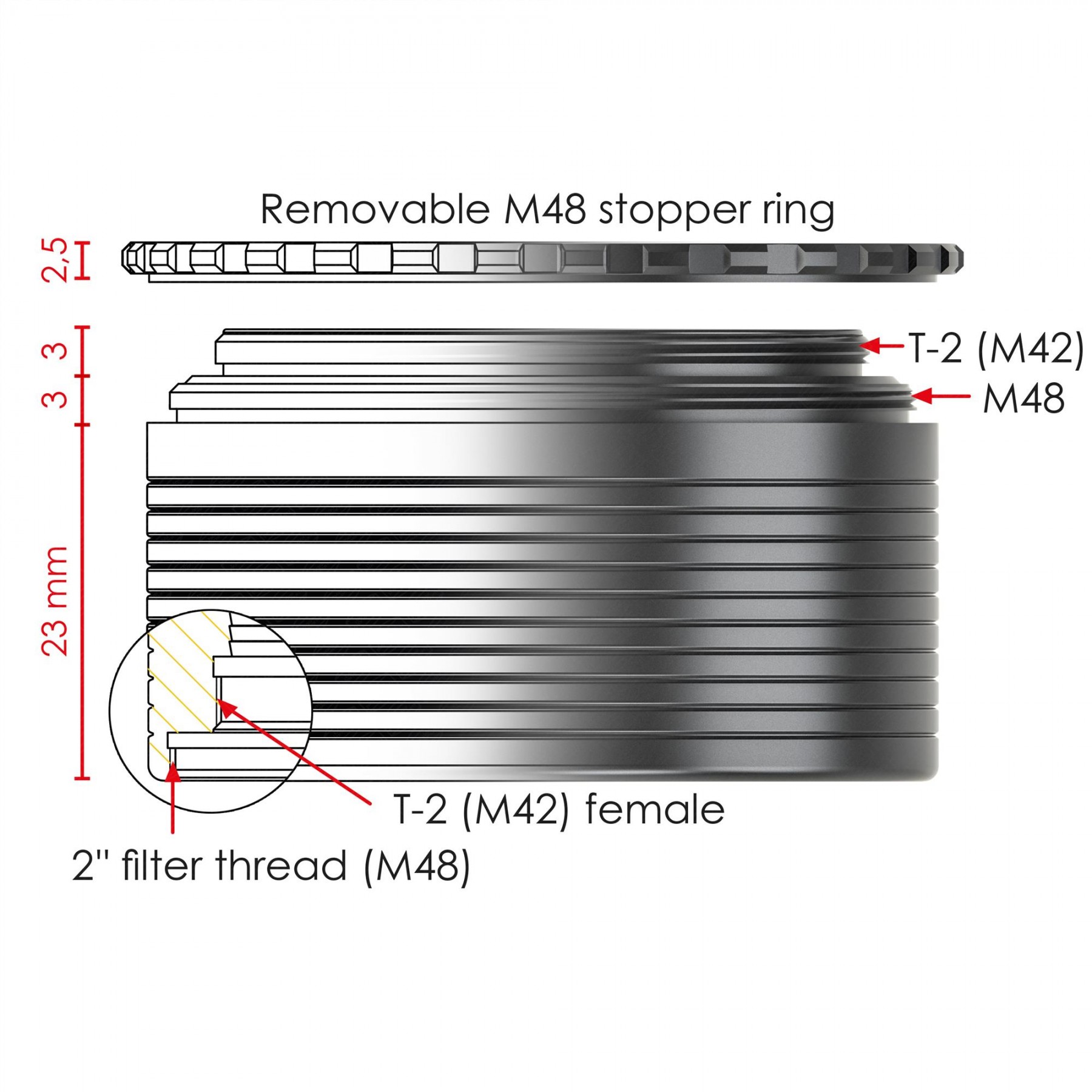 Teleskopseitig mit 2" Außendurchmesser und 48mm Filtergewinde für 2" Filter